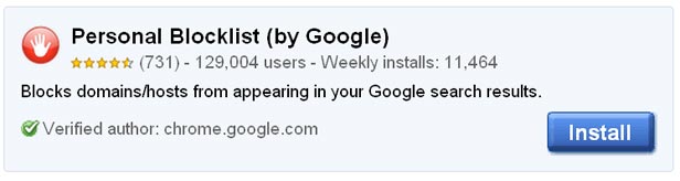 There are 129,004 people using the Personal Bocklist Chrome extension from Google. This is the browser extension that the company launched on February 14, ahead of the Panda Update, which lets users simply block domains from ever appearing in their Google search results.