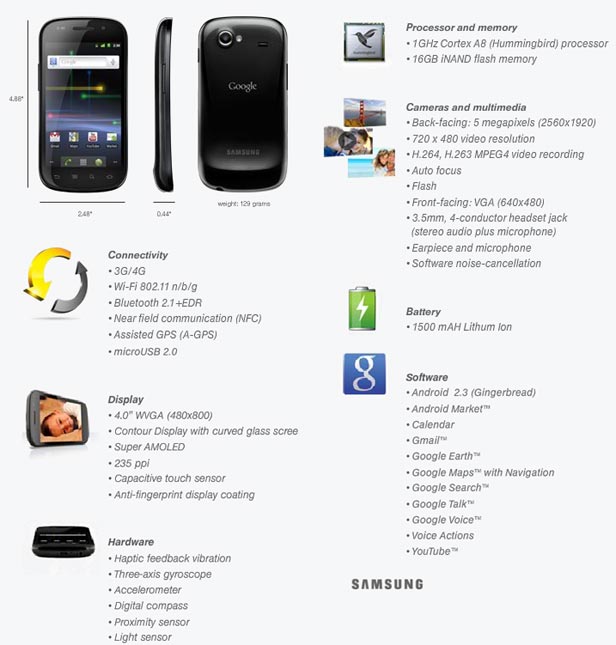 “We co-developed Nexus S 4G with Samsung to tightly integrate hardware and software and highlight the advancements of Gingerbread,” adds Rubin. “Nexus S 4G takes advantage of Sprint’s high-speed 4G data network. It features a 4″ Contour Display designed to fit comfortably in the palm of your hand and along the side of your face. It also features a 1GHz Hummingbird processor, front and rear facing cameras, 16GB of internal memory, and NFC (near field communication) hardware that lets you read information from everyday objects that have NFC tags.”