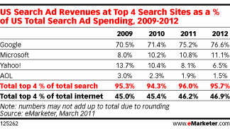 Google’s success is mostly to blame for these pessimistic estimates, as you probably guessed.  eMarketer thinks the search giant’s market share will rise from 71.4 percent in 2010 to 75.2 percent in 2011 to 76.6 percent in 2012.